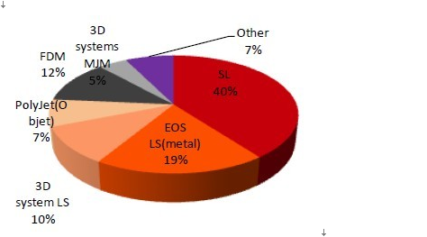 根據(jù)WohlersAssociates在2011-2012年的調(diào)查顯示:現(xiàn)階段,下游打印服務(wù)商安裝最多的是基于立體平板印刷(SL)技術(shù)的3D打印設(shè)備,占比高達(dá)40%。作為最早成形的3D打印技術(shù),占據(jù)較高的市場份額在情理之中。同時,技術(shù)發(fā)展相對較晚,以金屬為材料的激光打印設(shè)備,占比已經(jīng)接近20%。如圖50所示。